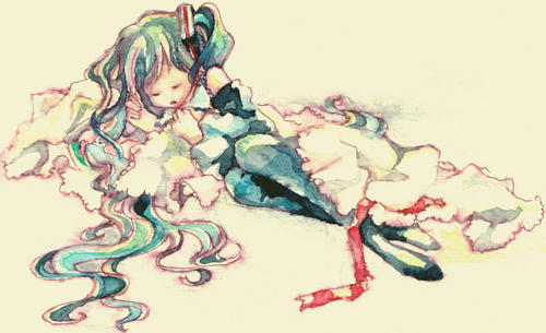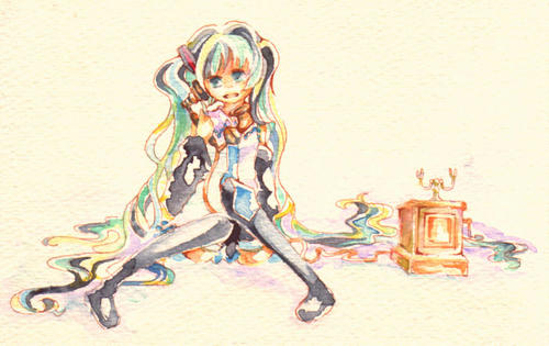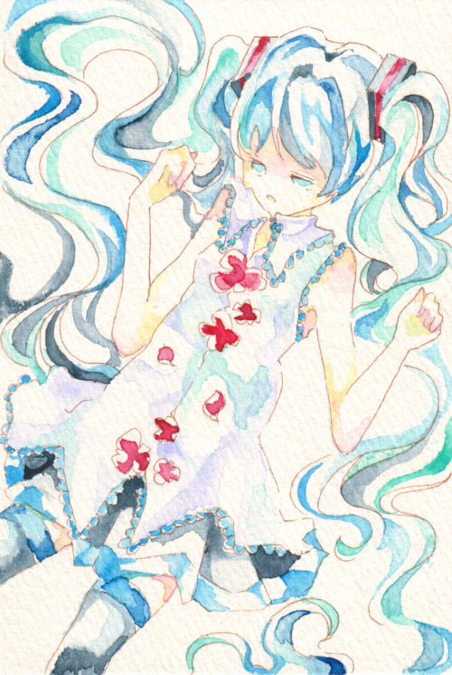 線画自体はちょっと前にトレーシングペーパーに描いたミクさんがあったので、それを水彩紙に写して描きました。